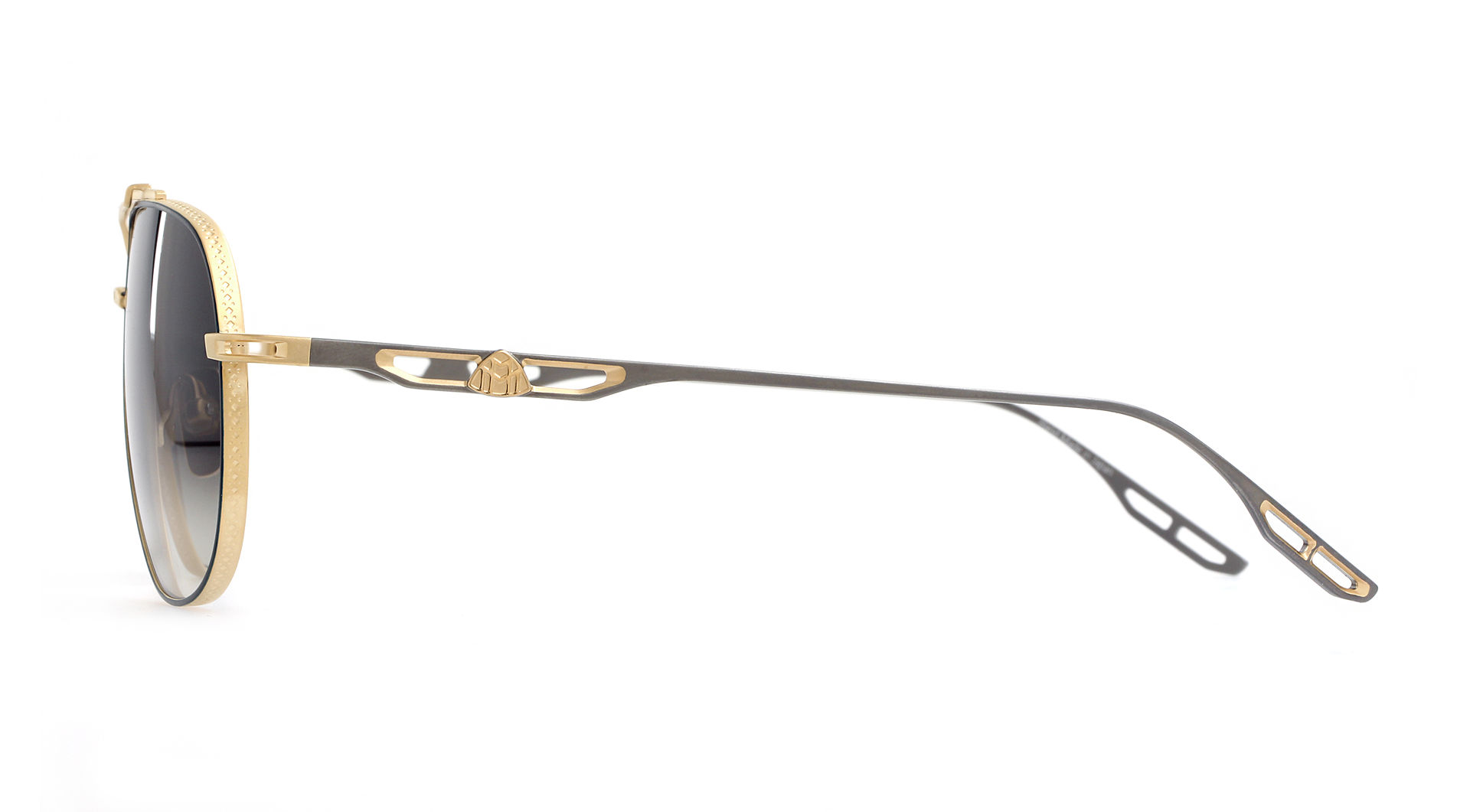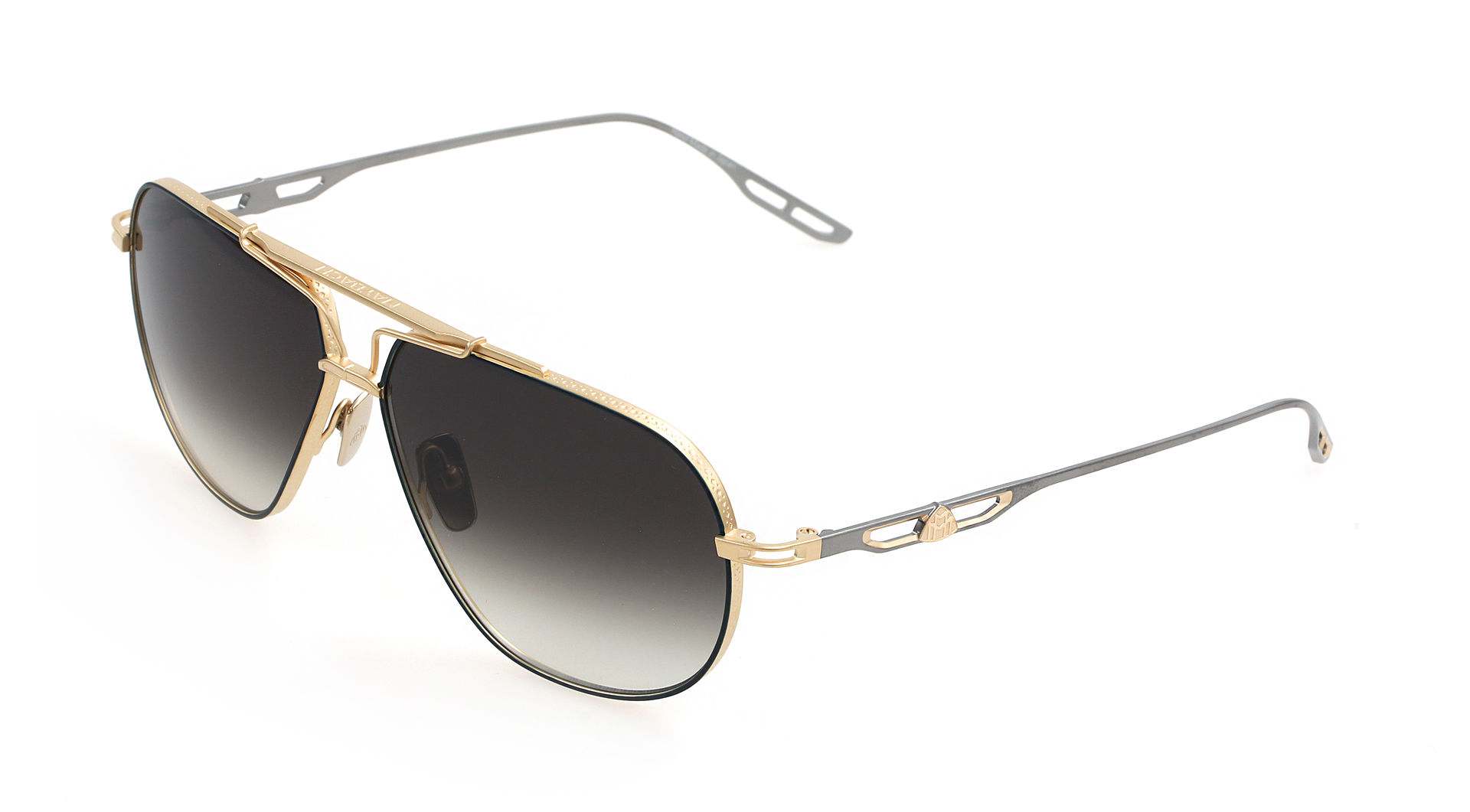 The clean, well-defined design language characterizes THE COMMANDER I. This titanium aviator with precious metal plating and ZEISS sun lenses presents an elaborate top-bar construction with Maybach lettering. Debossing on the bridge and pads, lens profiles with brogue pattern, and an open, air-flow temple design with integrated MAYBACH logo add to the frame’s classically cool appeal.